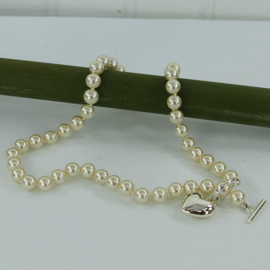 Single Strand Faux Pearl Necklace Silver Heart Bar Closure