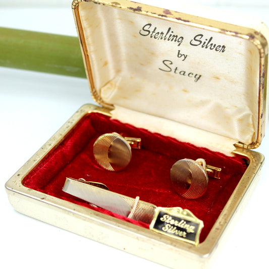 Stacy Sterling Tie Bar Cuff Links Set 1960s Original Box