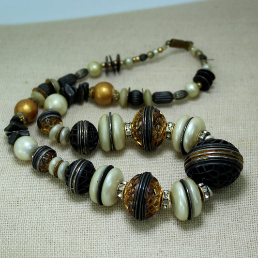 French Necklace 1980s Vintage Metal Cage Beads Pearl Disks Sparkle Spacers