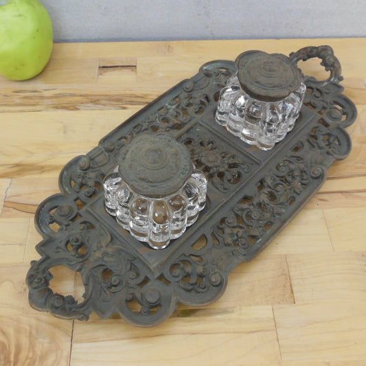 Golden Mfg. Co. Antique Bronzed Cast Iron Glass Inkwell Ornate