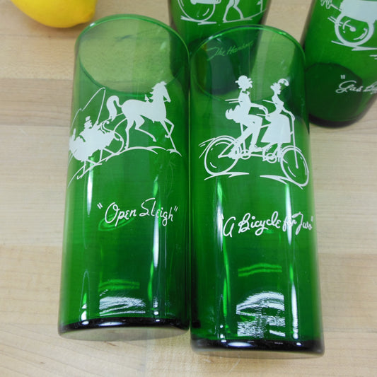 Anchor Hocking Forest Green Tall Drink Bar Glasses Horse Automobile Bicycle