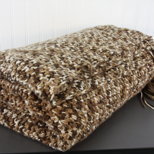 Hand Made Fringed Throw Variegated Brown Ivory Colored Yarn 46 X 72