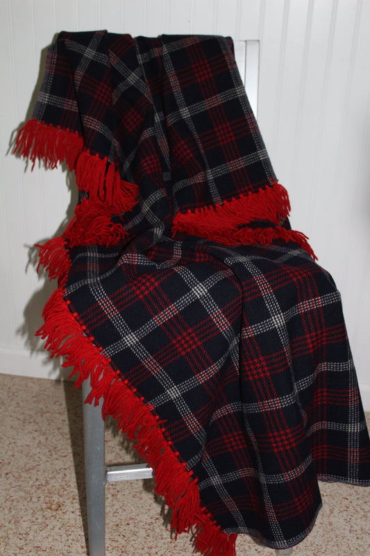 Hand Made Throw Blanket - Red White Navy, Wool Yarn Fringe - 57" X 52"
