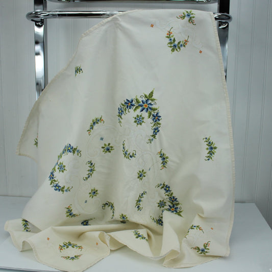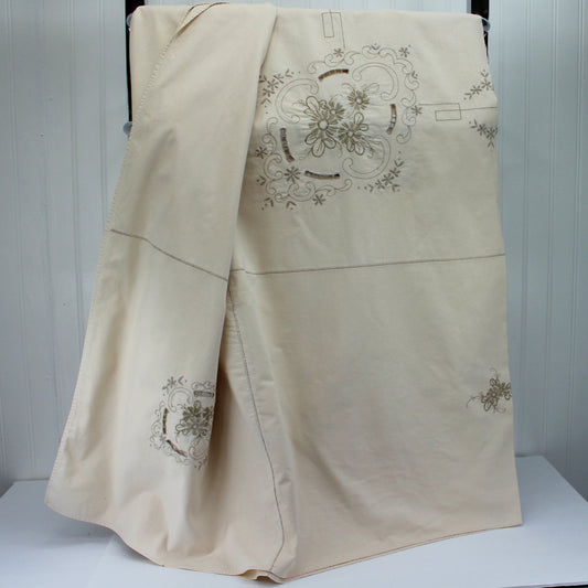Large Oval Bone Cotton Tablecloth Beige Embroidery Vintage 65" X 79" DIY Project