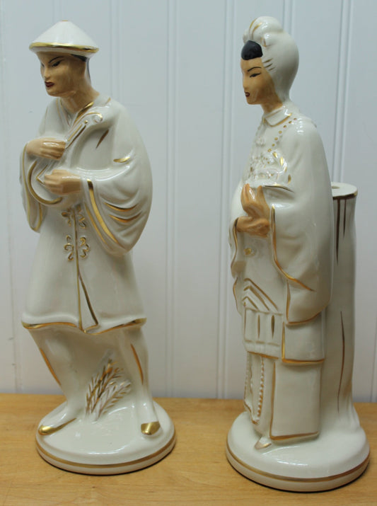 Vintage Asian Figures Lamp Bases Tall 14 1/2" White Heavy Gilt