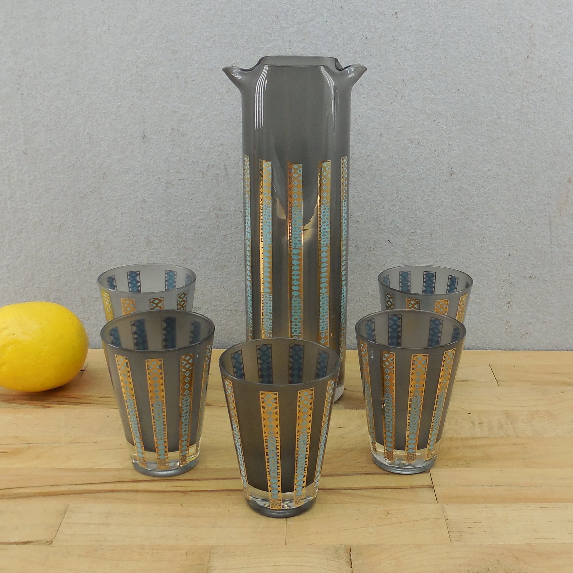 A vintage mid century cocktail pitcher and five tumbler set by Georges Briard. Smoked/frosted glass with 22K gold and aqua geometric linear pattern. Dual pour spouts, cylinder shaped.