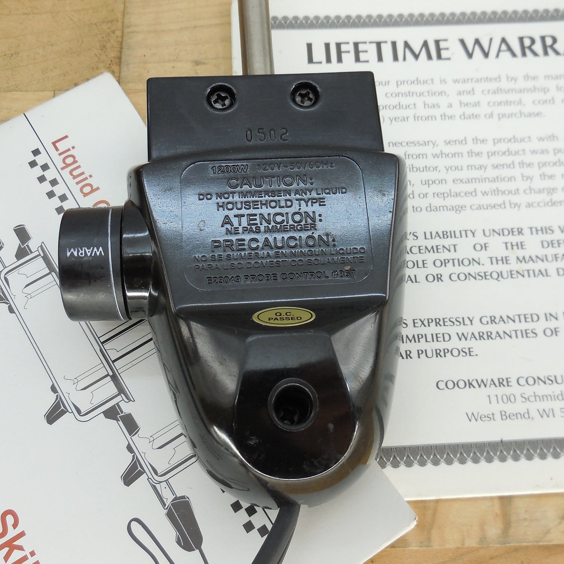 A high quality electric fry pan skillet in the Kitchen Craft line by West Bend USA. Stainless steel with liquid core heat. Model E23049 Cat. No. 010OCU with date code 05 24.