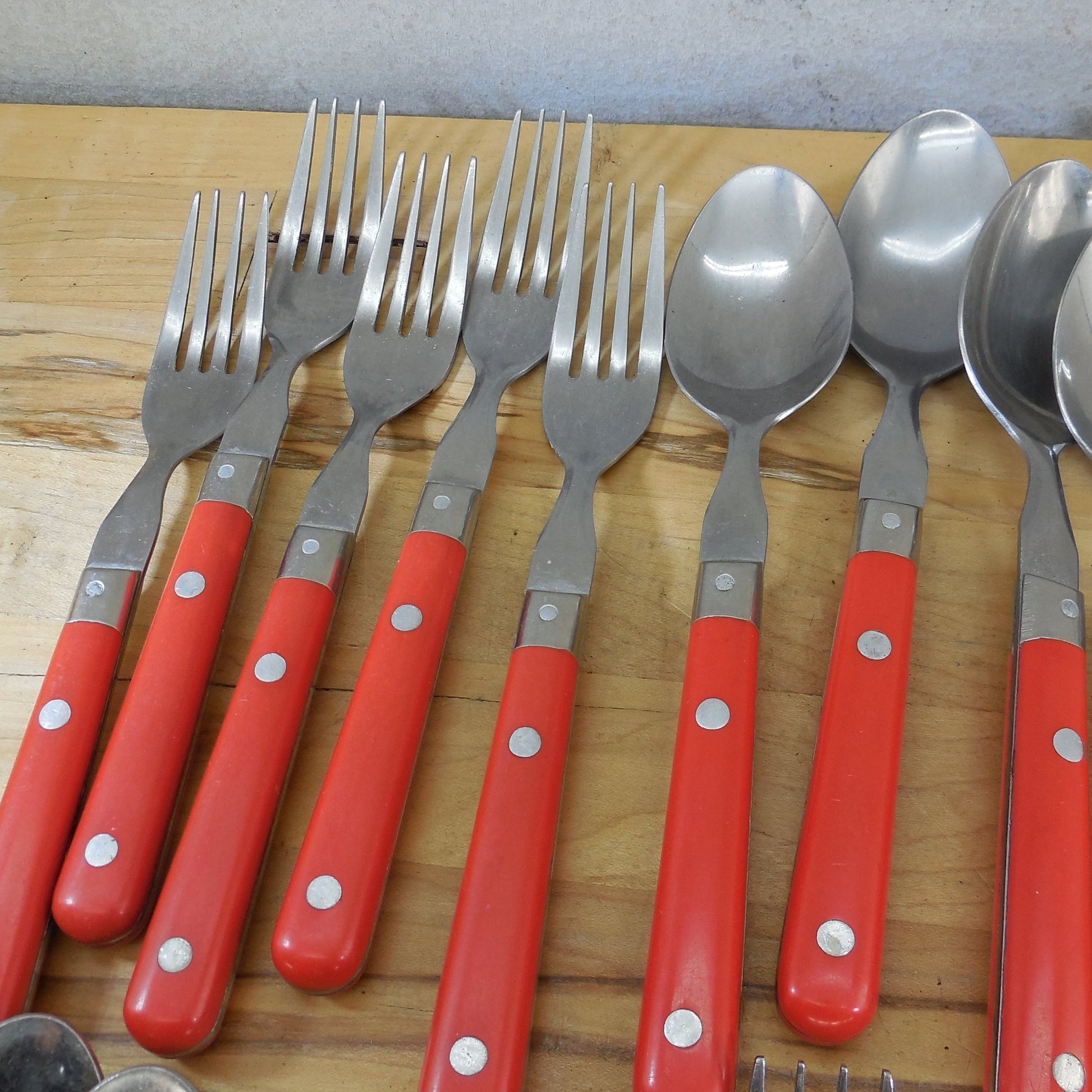 A partial set of vintage flatware by Washington Forge Korea in the Mardi Gras pattern - stainless steel with red composite handles.